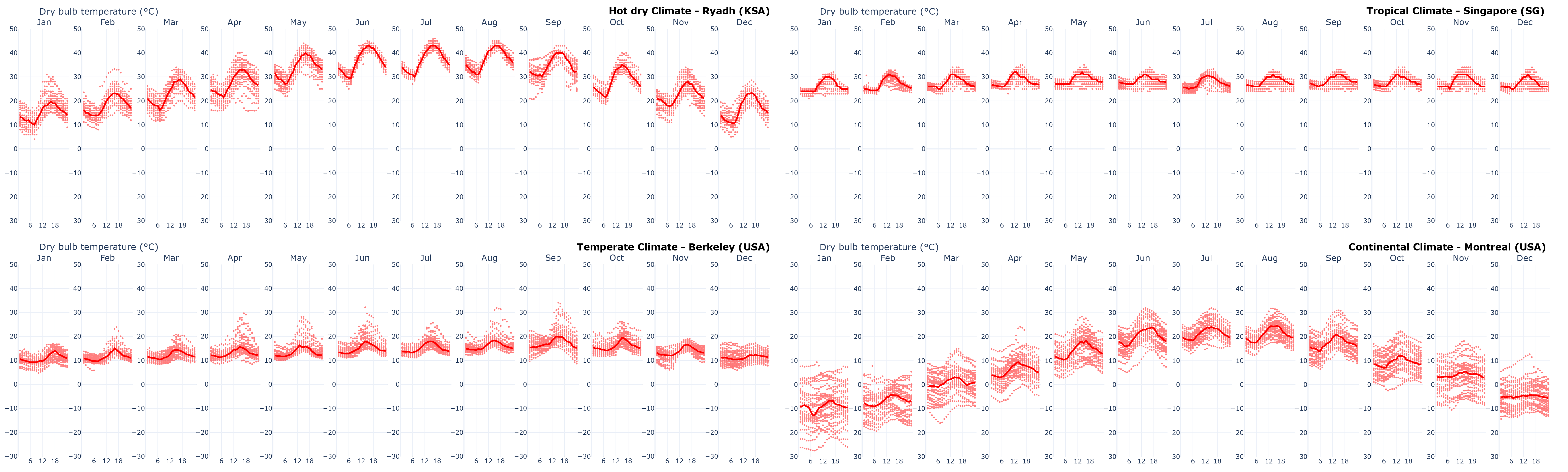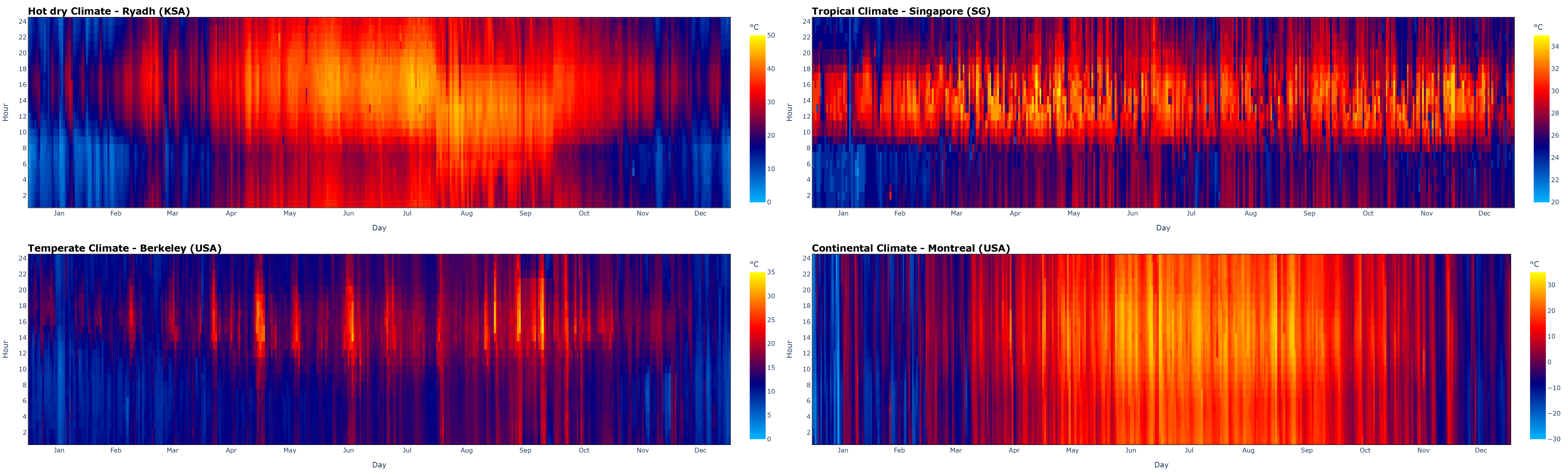 <figure><img src="https://491114279-files.gitbook.io/~/files/v0/b/gitbook-x-prod.appspot.com/o/spaces%2F-MhupA7DXRC4lRDTpJQJ%2Fuploads%2Fgit-blob-ca0797261da6a20d75d951735dab177777879672%2FT%20Heatmap.png?alt=media" alt=""><figcaption><p>Daily dry bulb temperatures heatmap for four common climatic conditions: hot dry, tropical, temperate, and continental</p></figcaption></figure>
