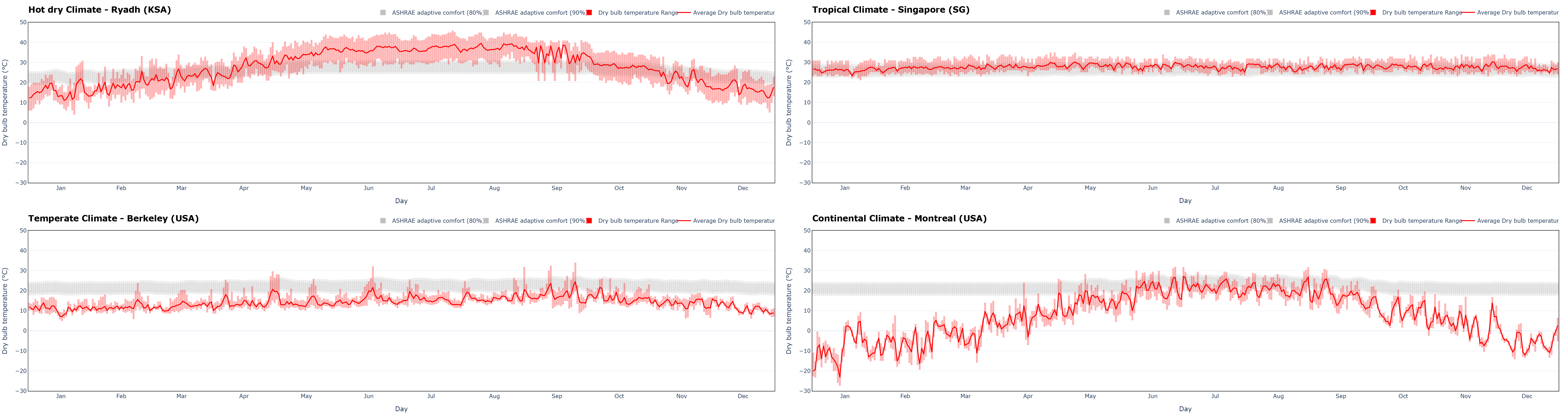<figure><img src="https://491114279-files.gitbook.io/~/files/v0/b/gitbook-x-prod.appspot.com/o/spaces%2F-MhupA7DXRC4lRDTpJQJ%2Fuploads%2Fgit-blob-d64e057c8363e1d4469bc5203975935c513aed59%2FT%20yearly.png?alt=media" alt=""><figcaption><p>Annual dry bulb temperatures trend in four common climatic conditions: hot dry, tropical, temperate, and continental</p></figcaption></figure>