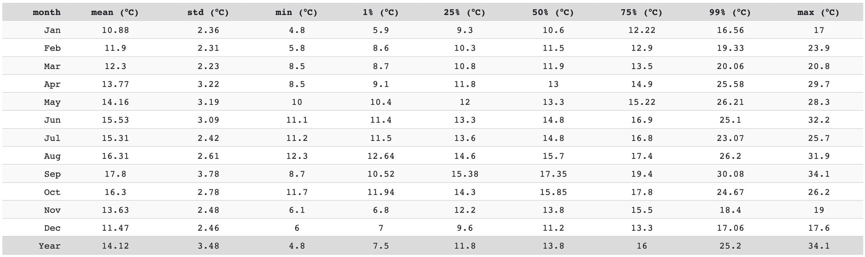 The last tool for temperature assessment is the statistics table. The earlier graphically made evaluations can be supported by the numbers. The following are listed, for each month: